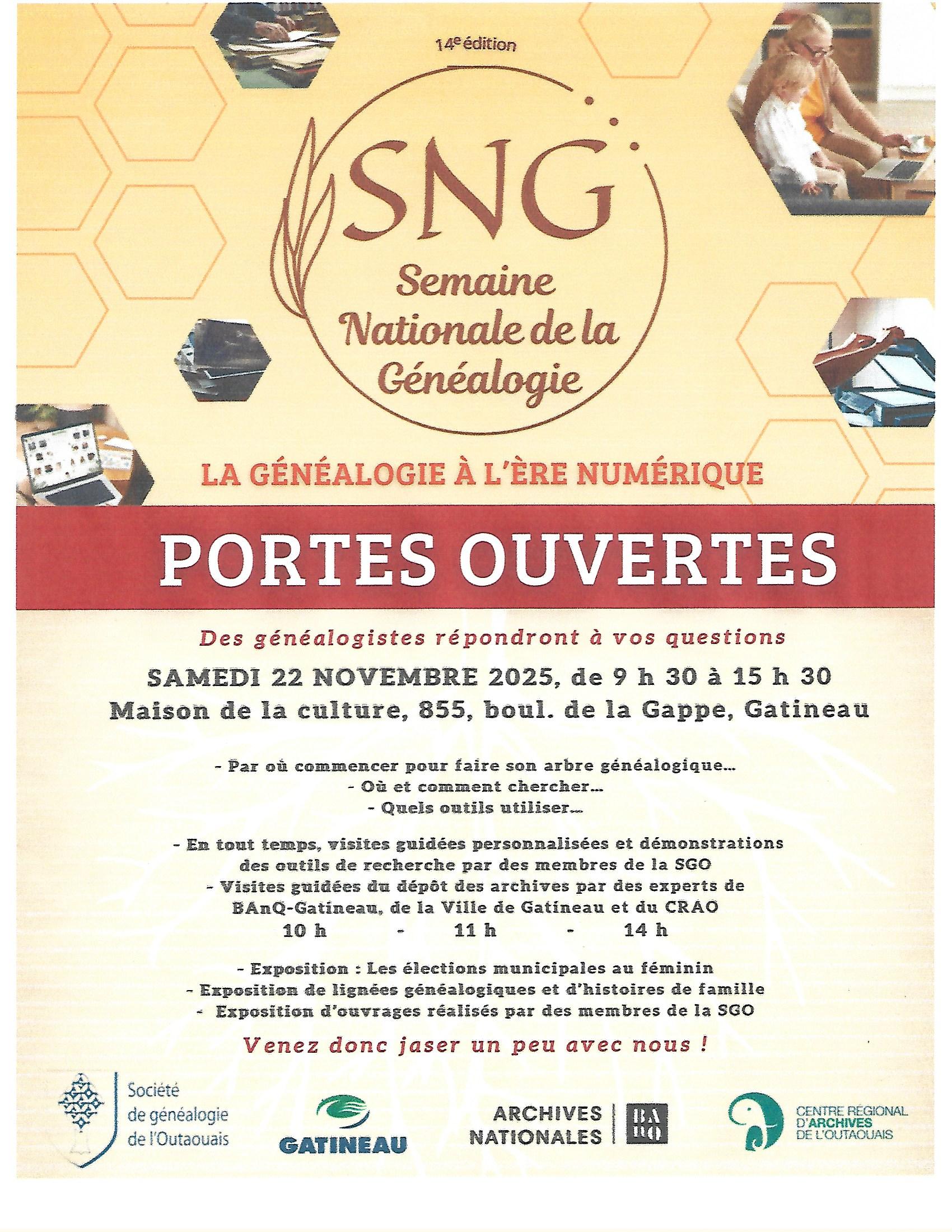 Il y aura donc visite de notre salle de recherche et des généalogistes prendront le temps de discuter avec vous de vos interrogations et même de s'assoir à l'un de nos postes informatiques et faire quelques recherches avec vous.