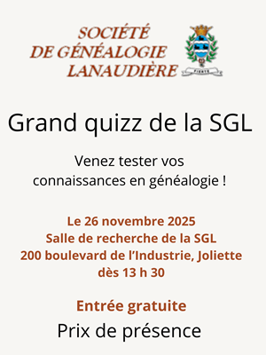 Atelier de recherche d'origines familiales sur des sites Web, suivi d'un quizz portant sur les connaissances en généalogie et sur la société de généalogie de Lanaudière. Prix de présence !