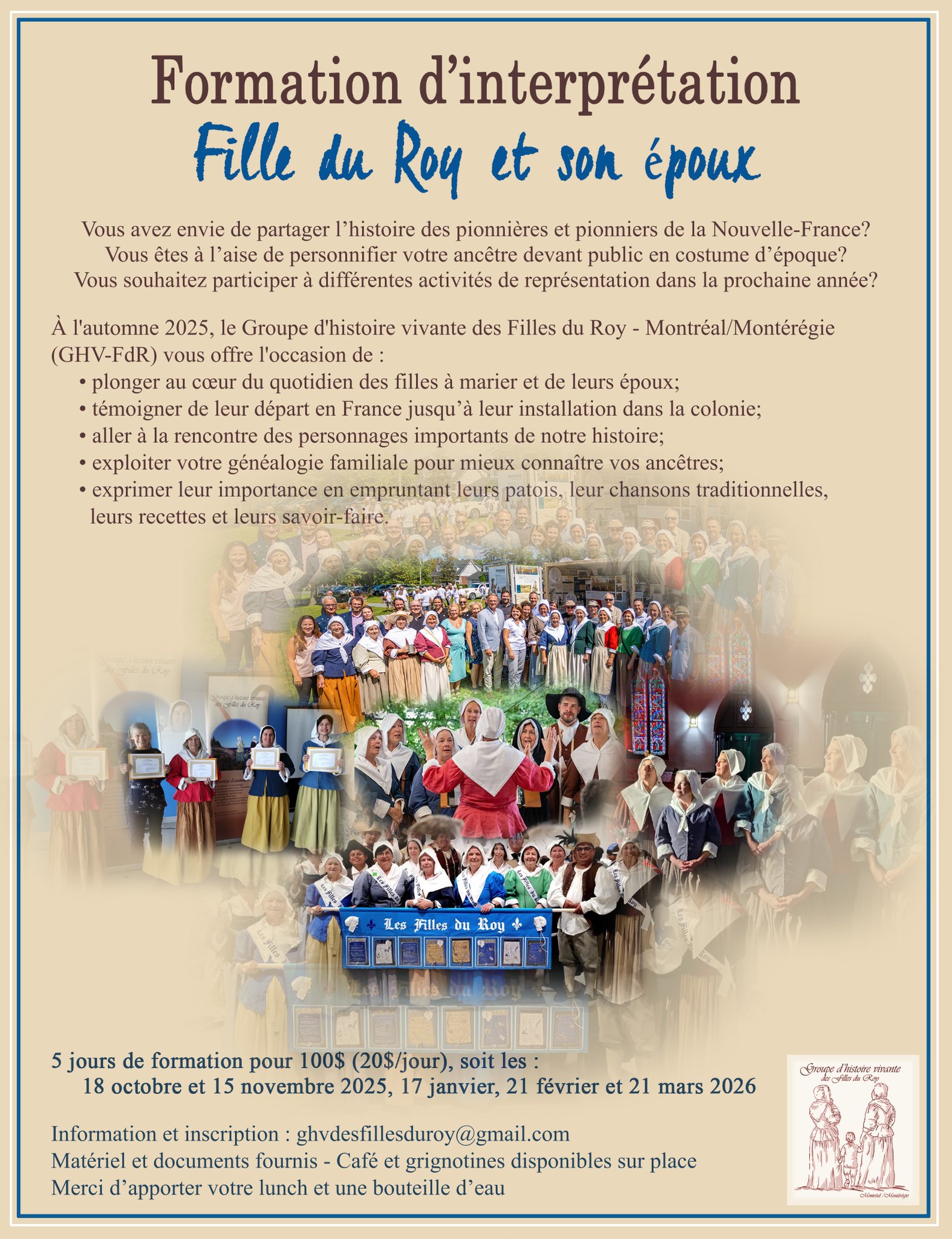 À l'automne 2025, le Groupe d'histoire vivante des Filles du Roy - Montréal/Montérégie (GHV-FDR) vous offre l'occasion de :