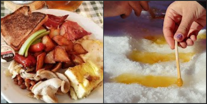 Les repas traditionnels sont réputés excellents et copieux, avec pain grillé, jambon au sirop d’érable, œufs cuits dans le sirop, oreilles de crisse, fèves au lard, omelette, pommes de terre grillées, crudités et salade de choux.